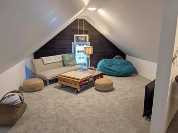 The Crow's Nest suite is a charming upgrade offered for the Crow's Nest room. Accessible through a stairway passage off the Crow's Nest bathroom, it adds extra elbow room and privacy during your stay. It features a second tv and large puzzle/game table. It can be purchased as an add on package when booking your room. Perfect for when staying with friends and family.