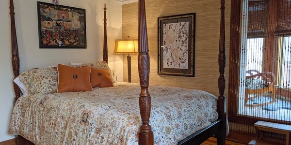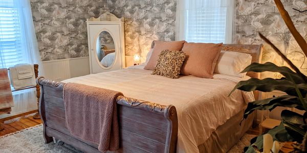The Flamingo room is a bright and spacious room and pays homage to our Florida roots with it's tropical feel. This sun-filled room has three windows which overlook the swim spa and the beautiful brick and stained glass windows of the Methodist Church next door. The room features a corner whirlpool tub with a shower wand, a king bed and private bath. Its essence of romance and peace provides a welcome sanctuary.